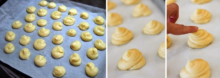 3. Αφήνουμε να κρυώσει η ζύμη, και την βάζουμε σε σακούλα του κορνέ με φαρδιά ίσια μύτη, και πάνω σε λαμαρίνα την οποία έχουμε στρώσει με χαρτί ψησίματος, φτιάχνουμε “μπαλίτσες” σαν μεγάλο καρύδι,(όπως στη φώτο), αφήνοντας 3-4 εκ. κενό μεταξύ τους, διότι θα φουσκώσουν.