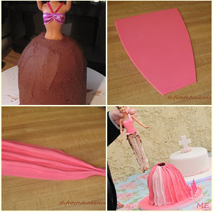 Στη συνέχεια κόψτε μακρόστενα κομμάτια με καμπυλωτές πλευρές και με τα δαχτυλάκια σας πιάστε το επάνω μέρος και κάντε το πλισέ. Κολλήστε επάνω στην τούρτα. Συνεχίστε γύρω γύρω ως ότου σχηματιστεί η φούστα.