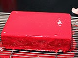 - Αδειάζουμε το γλάσο επάνω στην παγωμένη τούρτα, και προσέχουμε να πάει παντού, ώστε να καλύψει όλη την τούρτα και στα πλαϊνά.