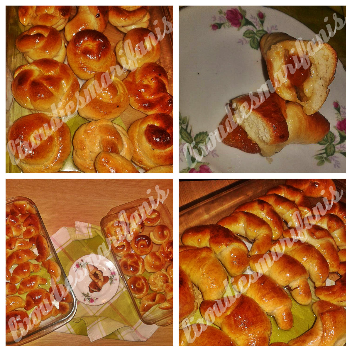 - Αραδιάζουμε σε ταψιά στρωμένα με αντικολλητικό χαρτί αραιά μεταξύ τους, αλείφουμε με το μείγμα αυγού και ψήνουμε σε προθερμασμένο φούρνο στους 180 με 200 βαθμούς μέχρι τα κρουασανάκια μας να φουσκώσουν και να αποκτήσουν ροδαλή και γυαλιστερή όψη. Αφήνουμε να κρυώσουν εντελώς, και με κοφτερό μαχαιράκι τα ανοίγουμε στο πλάι ώστε να τα γεμίζουμε εάν θέλουμε με τις μαρμελάδες κλπ