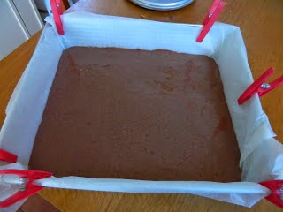 Ρίχνουμε το μισό από το μείγμα στο ταψί καλυμμένο με χαρτί λαδόκολλας. Για να εξασφαλίσουμε μια ακριβή διαίρεση της ζύμης και, ως εκ τούτου, δυο ισοπαχείς βάσεις ζυγίζουμε το μπολ που περιέχει την ζύμη ,και βάζουμε το μισό.. Αυτό είναι το ποσό που πρέπει να χύσετε μέσα στο ταψί, στη συνέχεια αφήστε το να σταθεροποιηθεί μέχρι να πάρετε ένα ομοιόμορφο πάχος. Χτυπήστε το ταψί πάνω στον πάγκο για να φύγουν οι φουσκάλες .