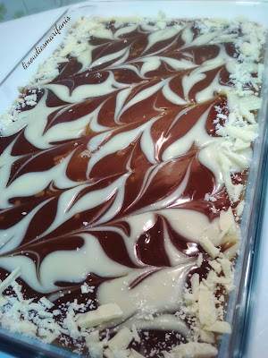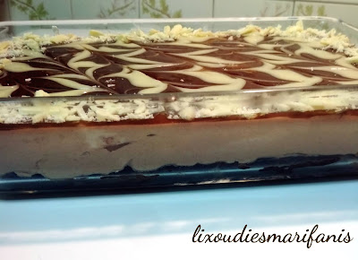 - Για το γαρνίρισμα: Ζεσταίνουμε το γάλα και λιώνουμε τη λευκή σοκολάτα μέχρι να γίνει μια ωραία λευκή γκανάζ. Κάνουμε γραμμές πάνω στην επιφάνεια του γλυκού και με οδοντογλυφίδα σχηματίζουμε “νερά”. Εάν θέλουμε στολίζουμε με επιπλέον ψιλοκομμένη κουβερτούρα. Η διαδικασία παρασκευής αυτού του γλυκού καλύτερα να γίνεται μια μέρα πριν κόψουμε το γλυκό.