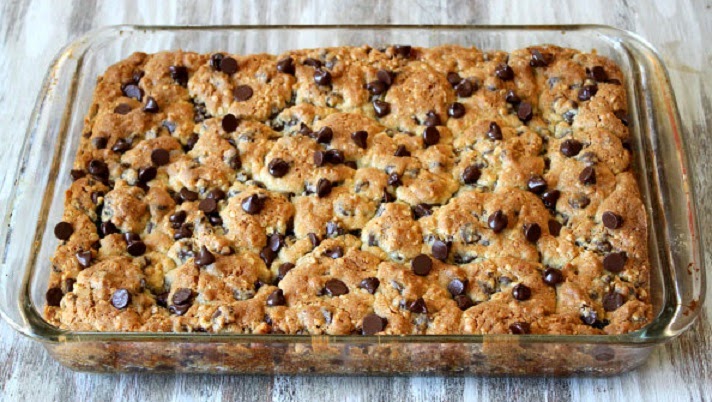 11. Το βγάζουμε από τον φούρνο, και πασπαλίζουμε τις υπόλοιπες σταγόνες σοκολάτας πάνω στο γλυκό όσο είναι καυτό, και στη συνέχεια το αφήνουμε να κρυώσει εντελώς.