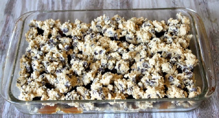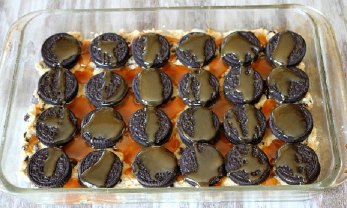 8. Περιχύνουμε την καραμέλα πάνω και γύρω από τα oreo, και πασπαλίζουμε τις σταγόνες καραμέλας.