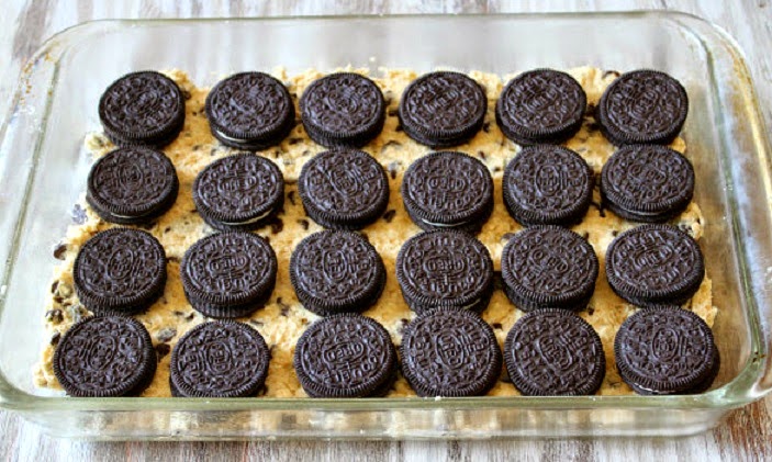 7. Απλώνουμε επάνω στη ζύμη τα μπισκότα oreo, το ένα δίπλα στο άλλο, 4 σειρές επί έξι.