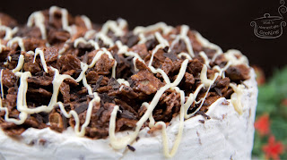 Προσθέτουμε λίγες νιφάδες μέσα στη γέμιση, λίγες από πάνω, διακοσμούμε με λίγη τριμμένη μαύρη σοκολάτα και γαρνίρουμε με πινελιές από λιωμένη λευκή σοκολάτα!!!!