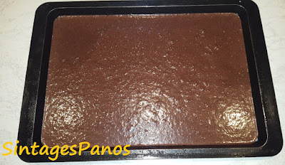 - Αδειάζουμε το μείγμα σε λαμαρίνα 30×40 εκ. στρωμένη με χαρτί ψησίματος, και απλώνουμε με μια παλέτα.