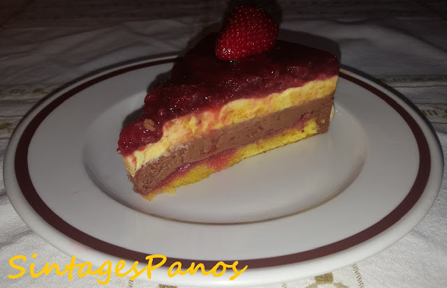 - Αδειάζουμε την μους σοκολάτας-καραμέλα στο τσέρκι επάνω στην επίστρωση φράουλας. Δεν πρέπει να υπερβαίνει τα 2 εκ. ύψος η μους.