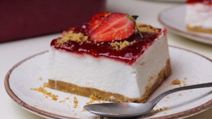 Είναι το cheesecake με την τραγανή, βουτυρένια βάση από μπισκότα Digestive που αγκαλιάζει απαλά την πλούσια, κρεμώδη κρέμα τυριού και γιαουρτιού. Από πάνω, η γλυκιά μαρμελάδα φράουλα απλώνεται σαν κόκκινο πέπλο, φέρνοντας μια δροσερή φρουτένια έκρηξη σε κάθε μπουκιά.
